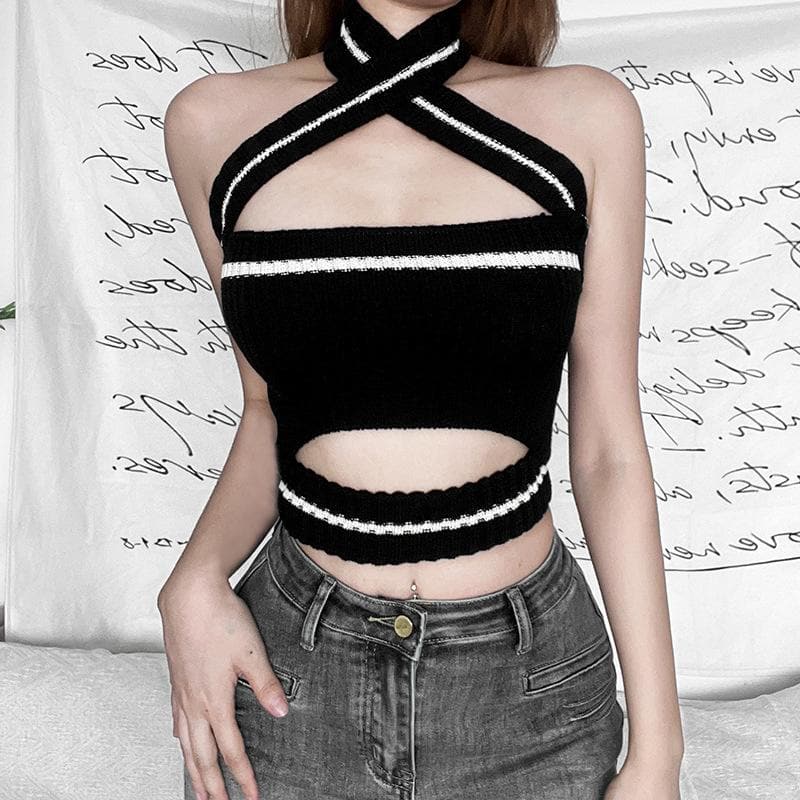 Knitted cross front halter contrast backless hollow out crop cut out top